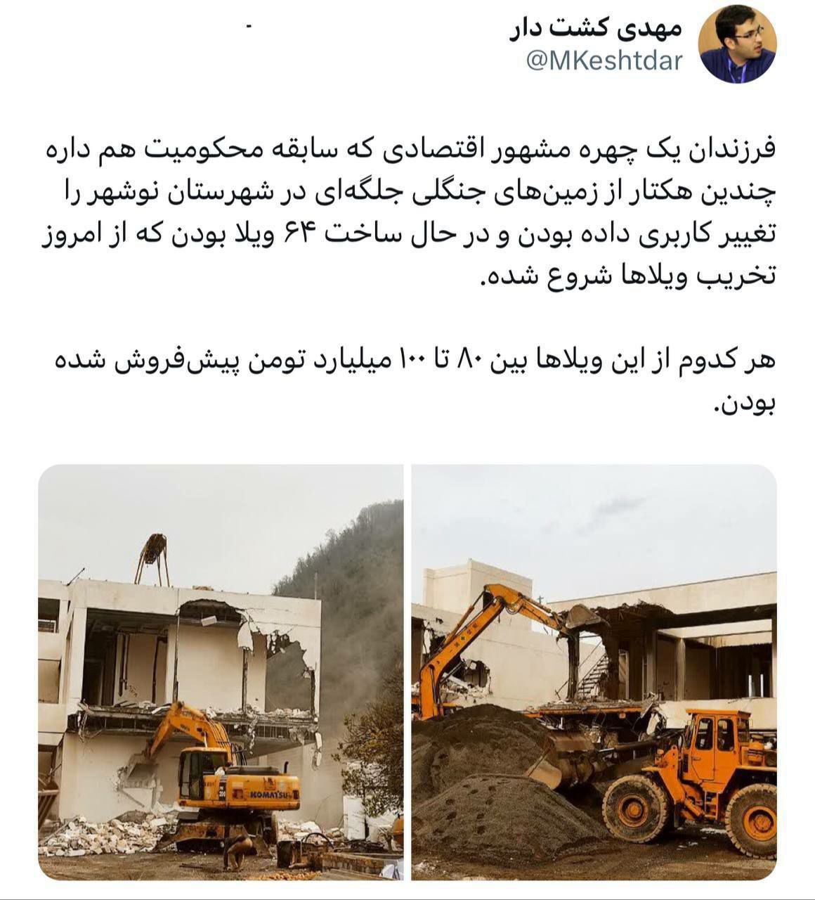 به گزارش خبرآنلاین، مهدی کشتدار در شبکه اجتماعی ایکس نوشت: «فرزندان یک چهره مشهور اقتصادی که سابقه محکومیت هم دارد، چندین هکتار از زمینهای جگلی جلگهای در شهرستان نوشهر را تغییر کاربری داده لودند و در حال ساخت ۶۴ ویلا بودند که از امروز تخریب ویلاها شروع شده است. هر کدام از این ویلاها بین ۸۰ تا ۱۰۰ میلیارد تومان پیش فروش شده بودند.