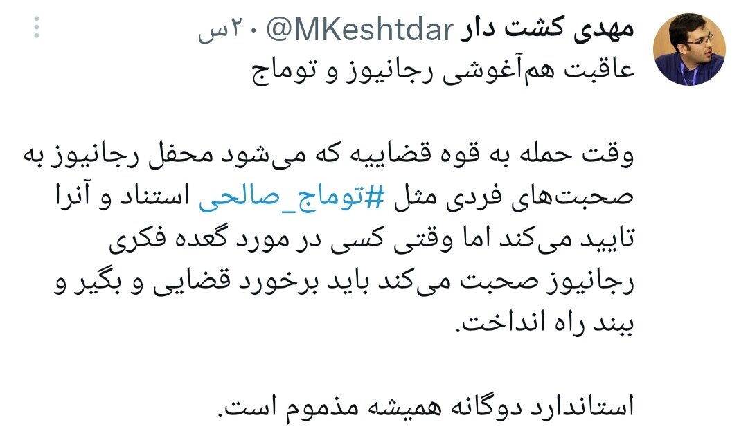 او نوشت: «وقت حمله به قوه قضاییه که میشود، محفل رجانیوز به صحبتهای فردی مثل #توماج_صالحی استناد و آن را تایید میکند اما وقتی کسی در مورد گعده فکری رجانیوز صحبت میکند، باید برخورد قضایی و بگیر و ببند راه انداخت. استاندارد دوگانه همیشه مذموم است.»